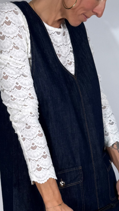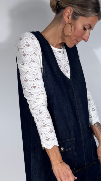 • Le col V profond apporte une touche de féminité subtile et un brin audacieuse, contrastant joliment avec l’esprit casual du denim.