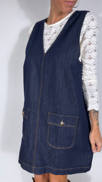 • Cette robe courte salopette en jean brut allie modernité et décontraction avec brio.