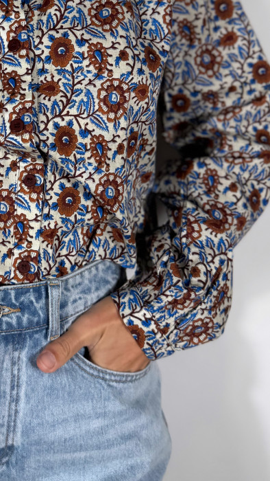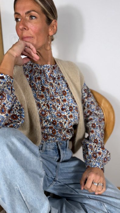 • Laissez-vous emporter par le raffinement de ce chemisier à col rond, sublimé par de délicats motifs arabesques dans des nuances de bleu profond et de camel chaud.