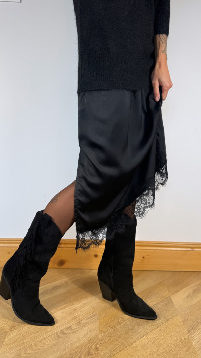 • La finition en dentelle fine au bas de la jupe vient ajouter une touche de romantisme et de sophistication, pour une allure à la fois cosy et glamour.