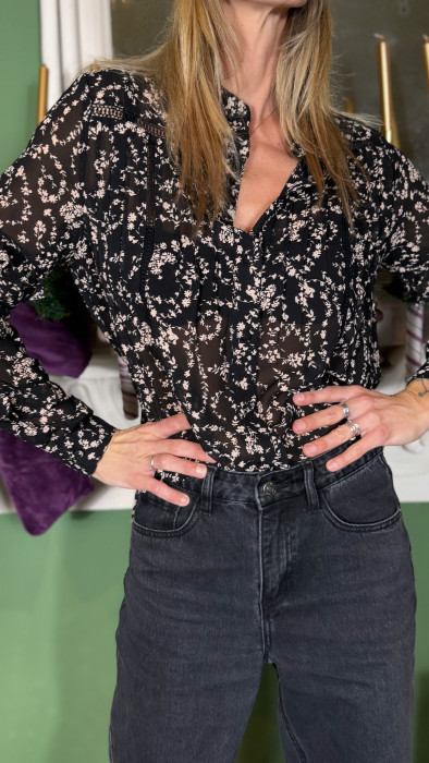 • Jolie petite blouse noire délicatement transparente, sublimée par des détails floraux coloris écru qui apportent légèreté et raffinement.