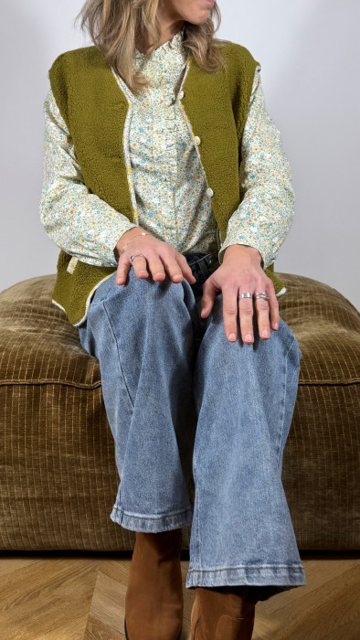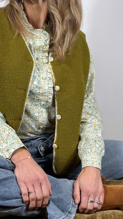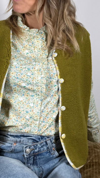 • un gilet en sherpa couleur olive, doux et enveloppant, pensé pour être enfilé facilement au-dessus d’une chemise.