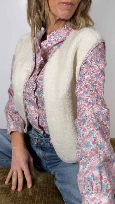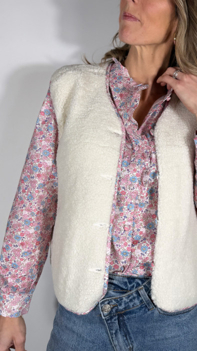 • un gilet en sherpa écru, doux et enveloppant, conçu pour se porter facilement par-dessus une chemise.