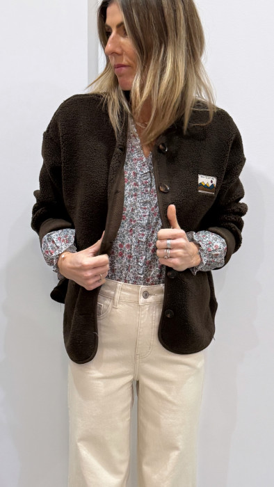 • Une veste sans col en moumoute couleur chocolat, chaleureuse et élégante.
