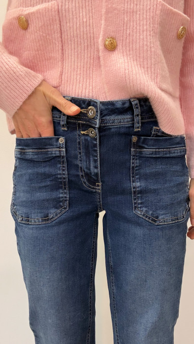 • Le jean comporte deux poches plaquées à l’avant, ajoutant un détail pratique et sobre qui renforce le style minimaliste.