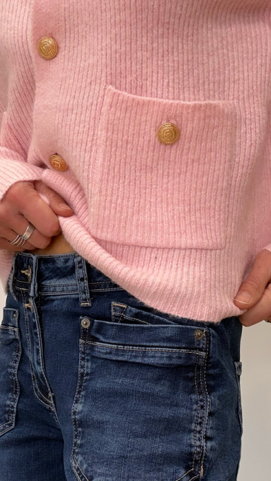 • Sur le devant, le gilet se ferme avec de jolis boutons dorés, véritables détails bijoux qui illuminent la pièce.