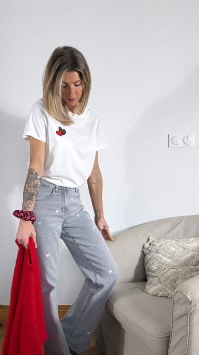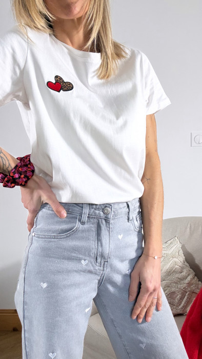 • Sur la poitrine, deux cœurs entremêlés — l’un à l’imprimé léopard, l’autre rouge — apportent du caractère et une note tendance.