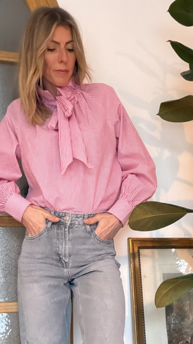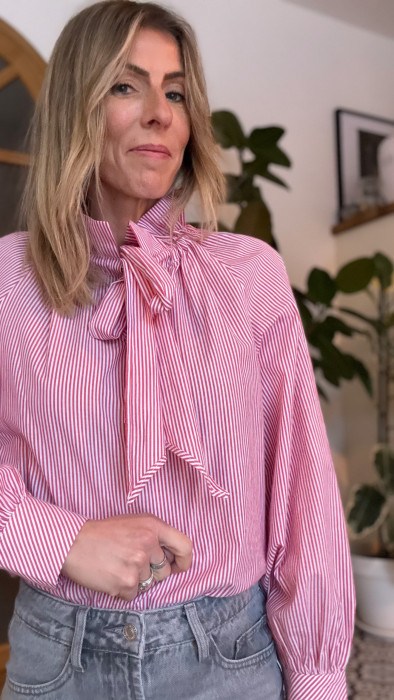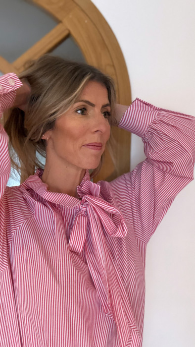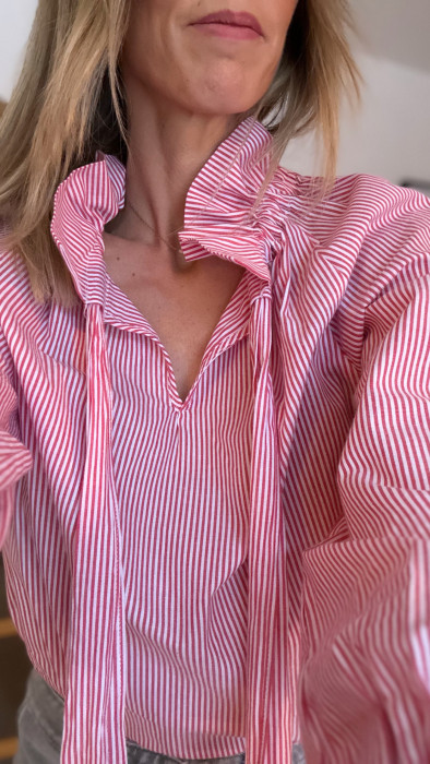 • Chemise en coton rouge à fines rayures blanches, légère et élégante.