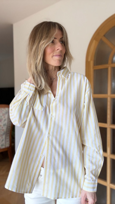 • chemise à rayures jaune pâle et blanc, délicate et pleine de fraîcheur.