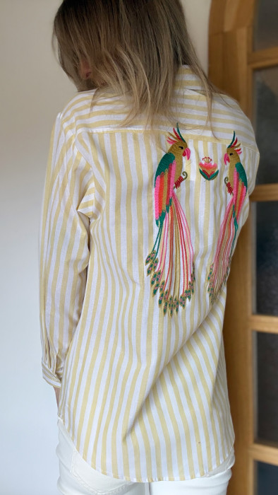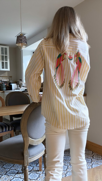 • Dans le dos, la chemise révèle tout son charme : une broderie représentant deux oiseaux délicatement réalisés. Les oiseaux, finement dessinés, peuvent être posés face à face ou en mouvement, symbolisant liberté et légèreté.