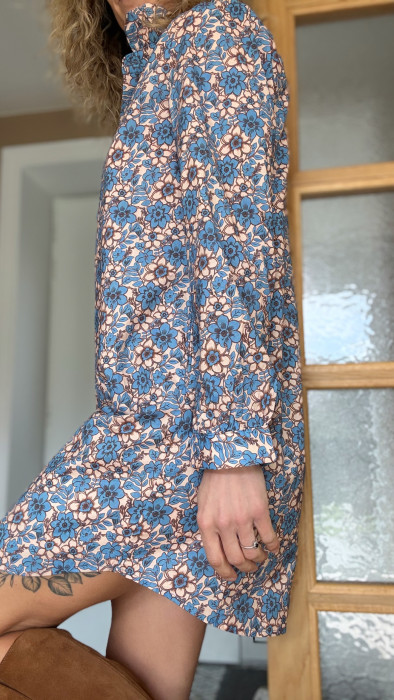 • Le tissu est orné de jolis motifs fleuris dans des tons de bleu et de beige, créant un ensemble doux et harmonieux.